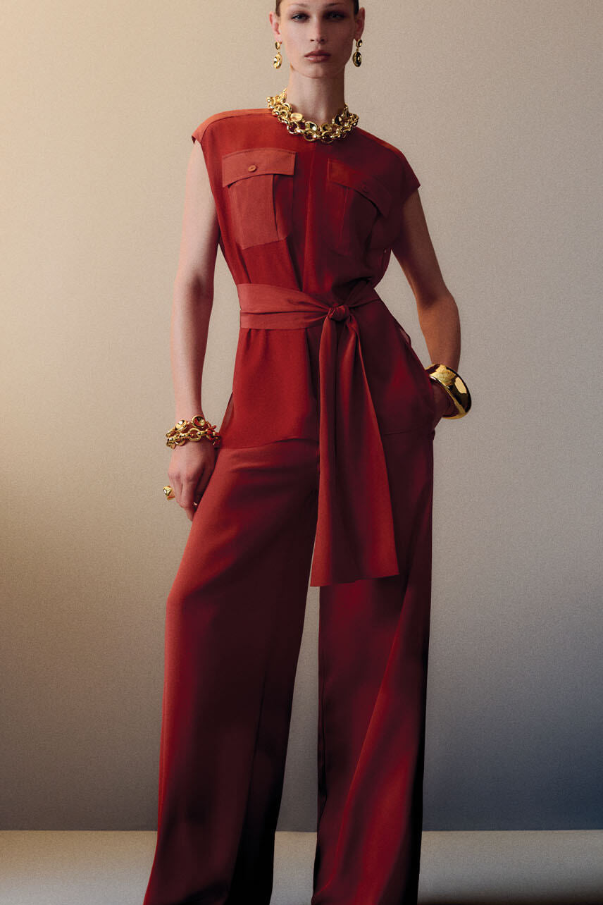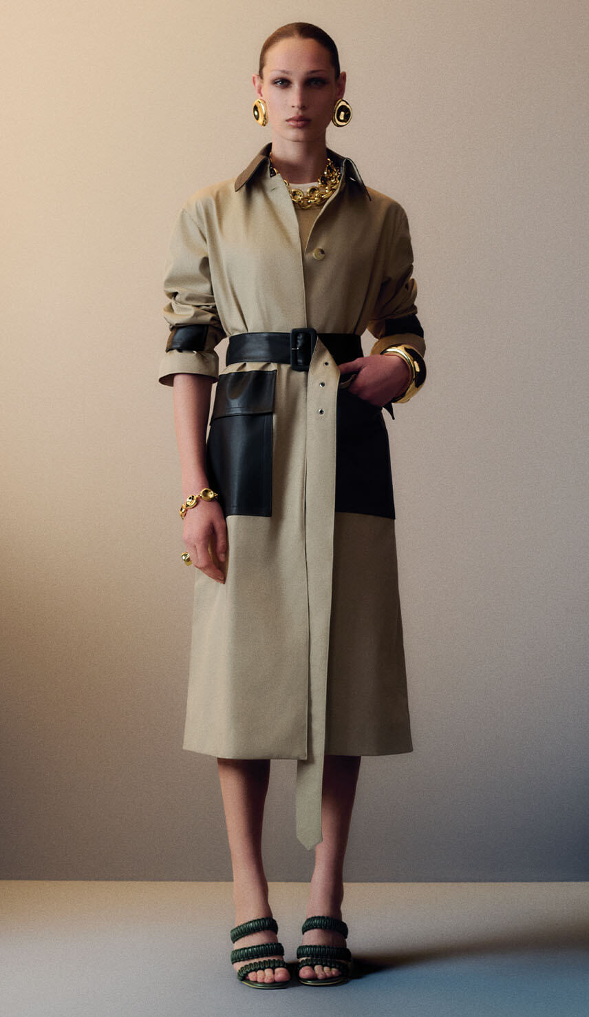 Palm green and organic stone hues anchor the edit, evoking the desert gardens of Marrakech but also introducing a utilitarian feel. This utility styling is further expressed via patch pockets, sharp collars, belted waists, stiff cottons and trench silhouettes that subtly borrow from male codes of dress.