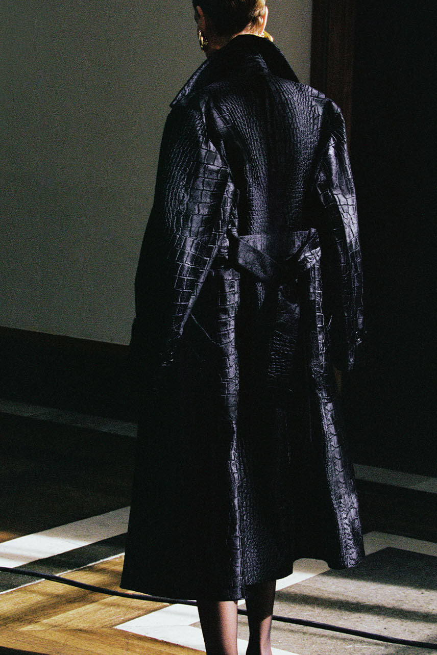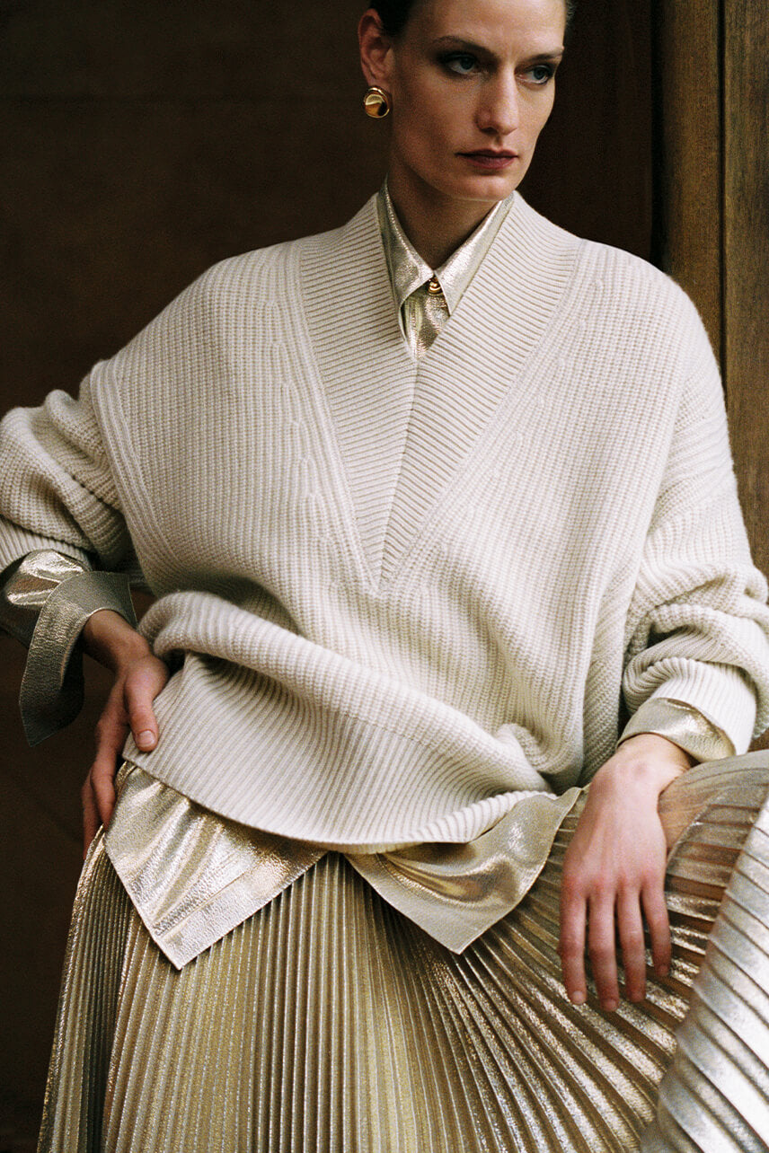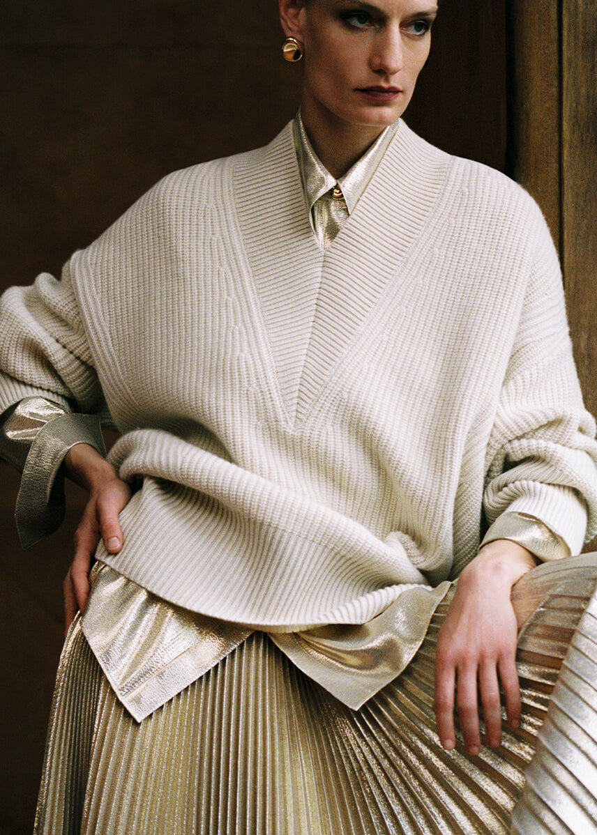Intricate, artisanal detailing and surface texture stand out. From croc-embossed shearling to an innovative fluid double satin, sumptuous fabrics appeal to the senses with their heightened tactility. Multi-size, hand-sewn matte sequins add lustre and movement, whilst a gold lamé pleated skirt brings festive shimmer.