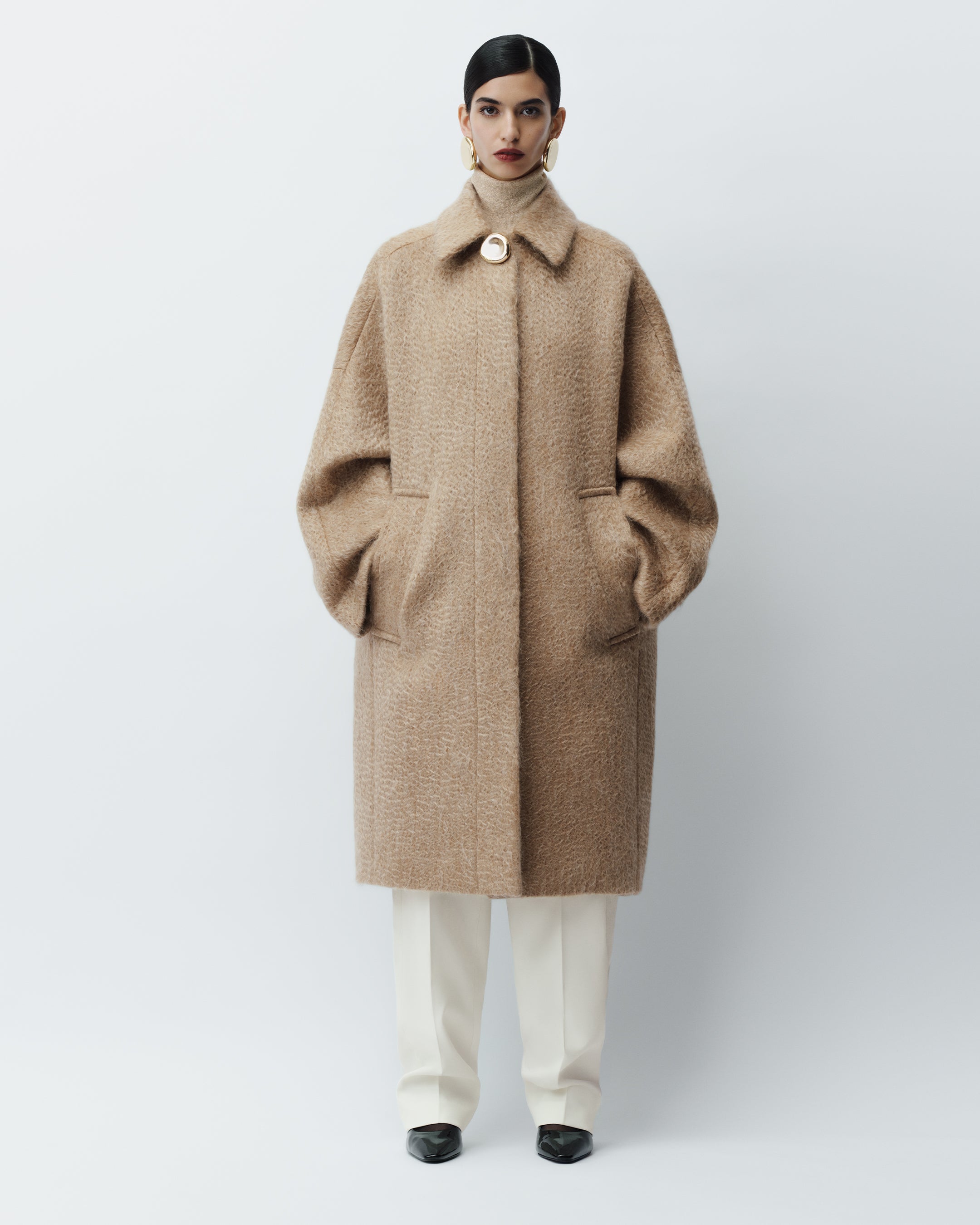 Alger Water Weave Wool Coat, Leblanc Lurex Knit Jumper, Aix Tailored Crepe Trousers