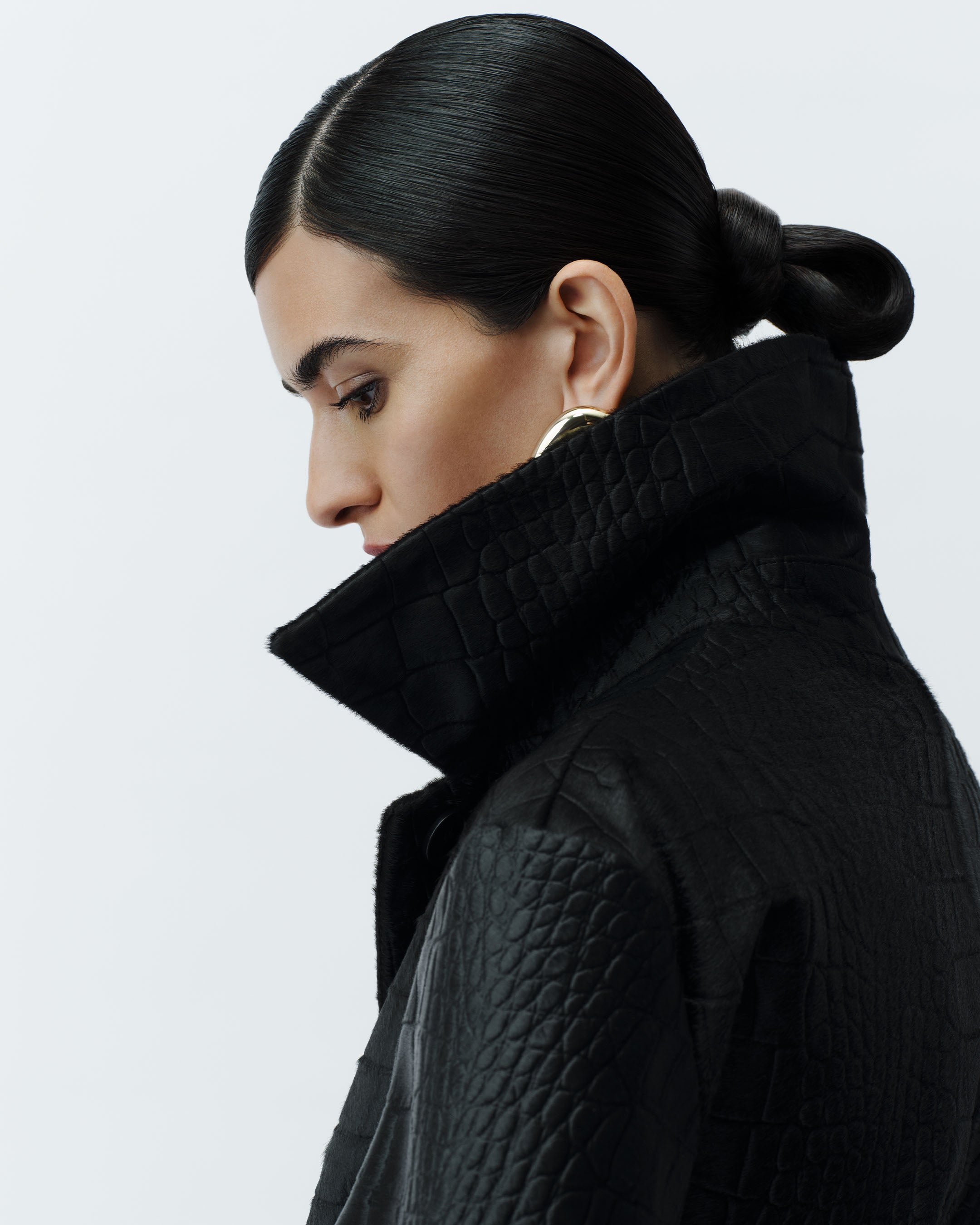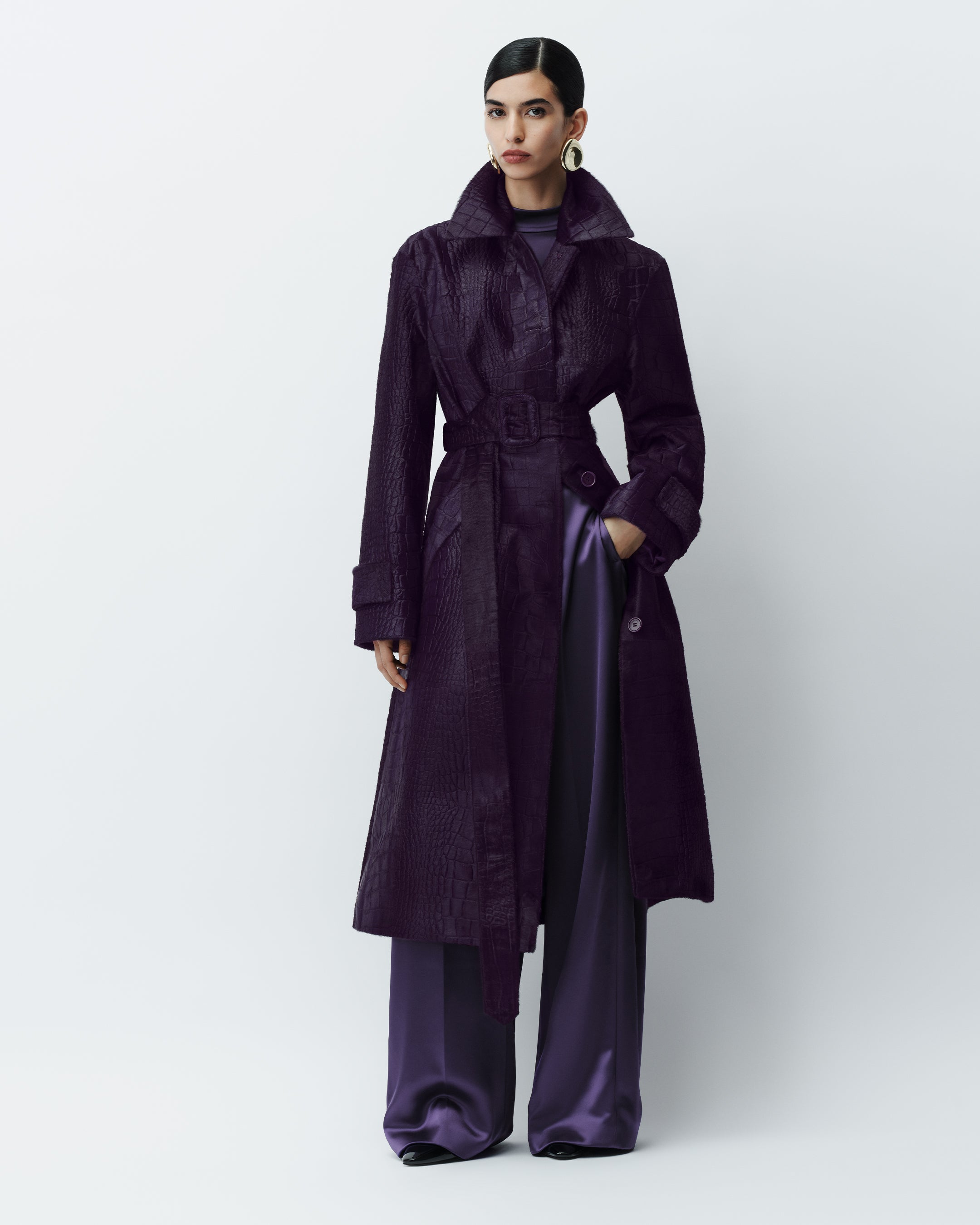 Auger Embossed Croc Leather Coat, Cave Double Satin Blouse, Dijon Double Satin Trousers