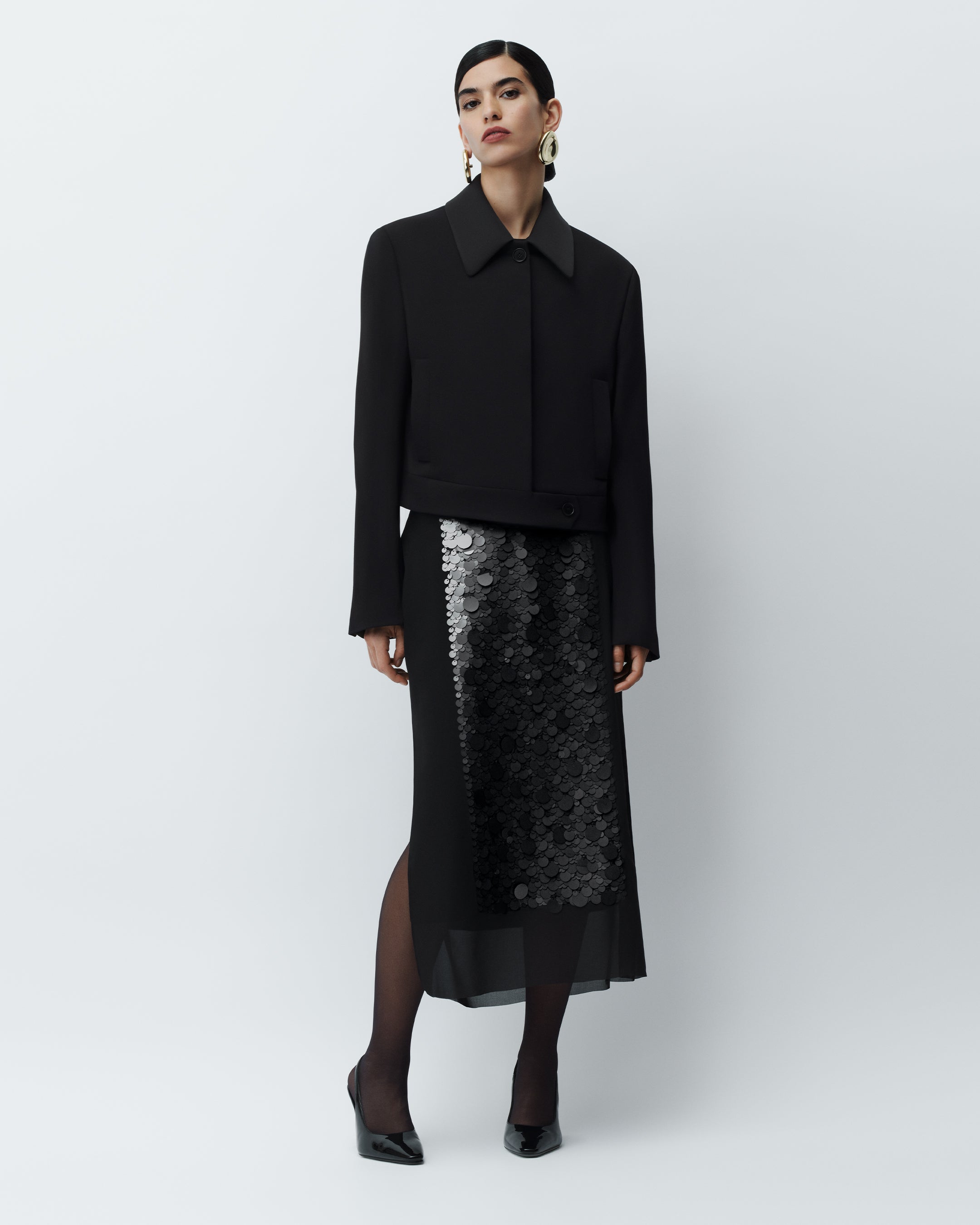 Abbe Tailored Crepe Jacket, Cambo Chiffon Sequin Skirt