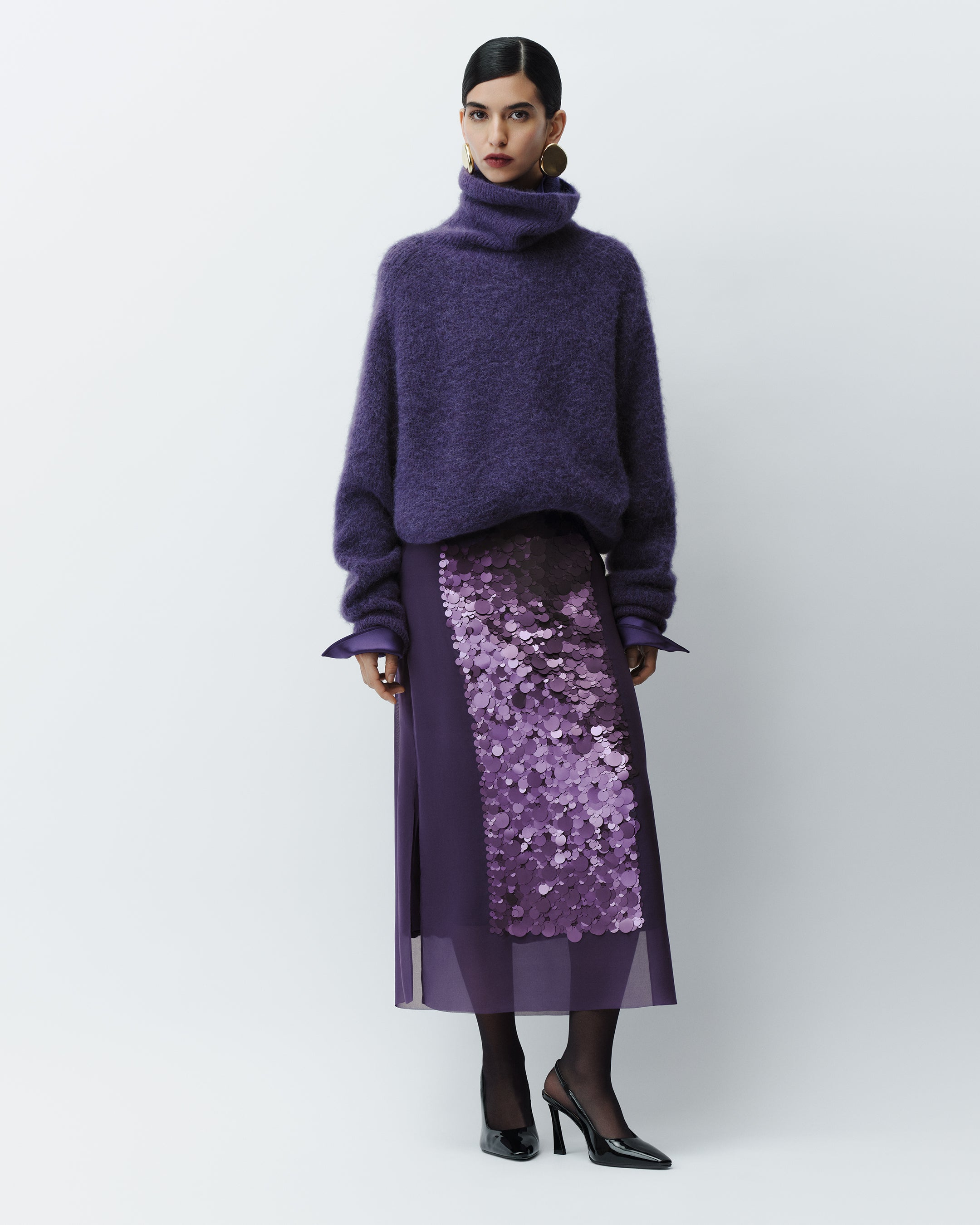 Meslay Brushed Alpaca Jumper, Dieu Double Satin Blouse, Cambo Chiffon Sequin Skirt