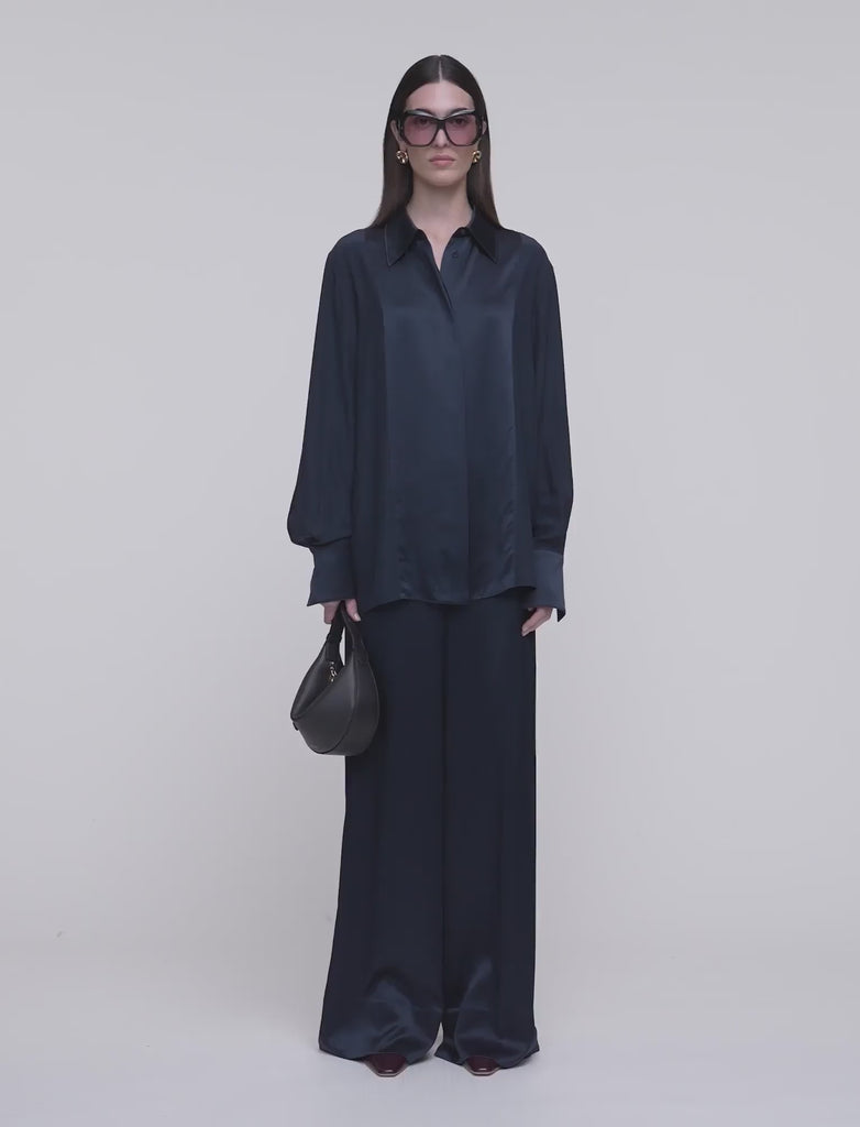 The Dijon Silk Satin Trousers are a high-rise, wide leg trouser, crafted from a lustrous silk with an ultra-smooth hand feel and fluid drape. A flat front and elasticated back waistband ensure both a clean finish and elegant silhouette.