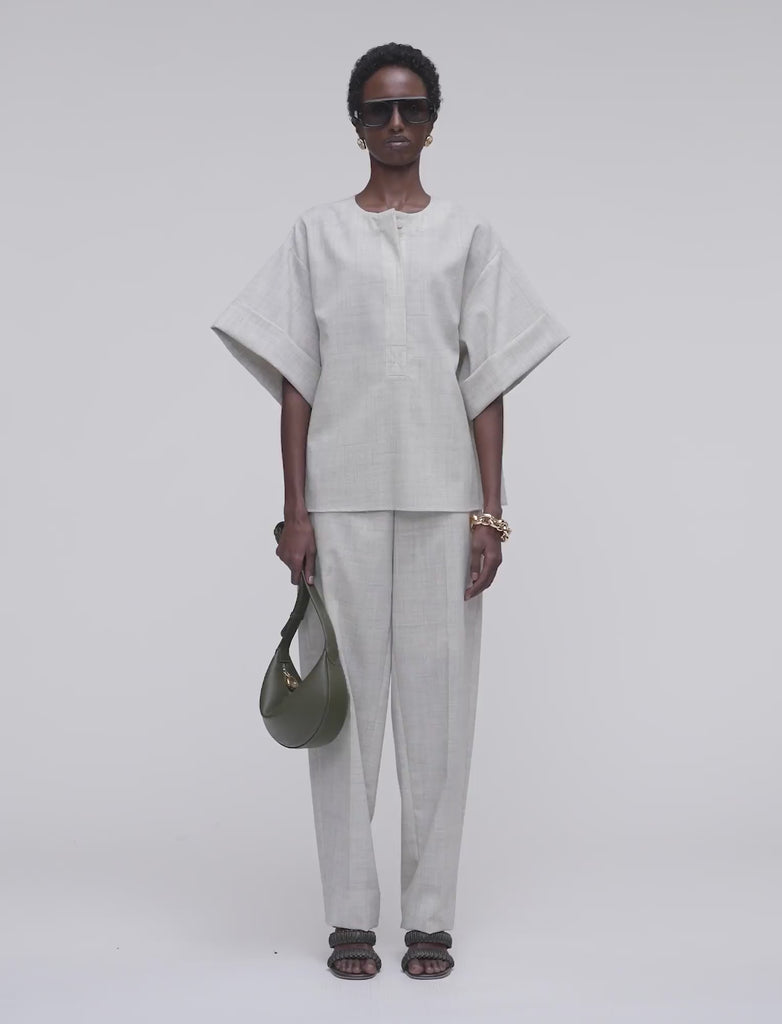 Le Blouse Yani en laine légère est un style de coupe surdimensionnée, fabriqué à partir de laine vierge de qualité. Alliant élégance et proportions dynamiques, il présente des manches évasées avec des poignets retroussés et un col rond épuré avec une patte de boutonnage dissimulée.