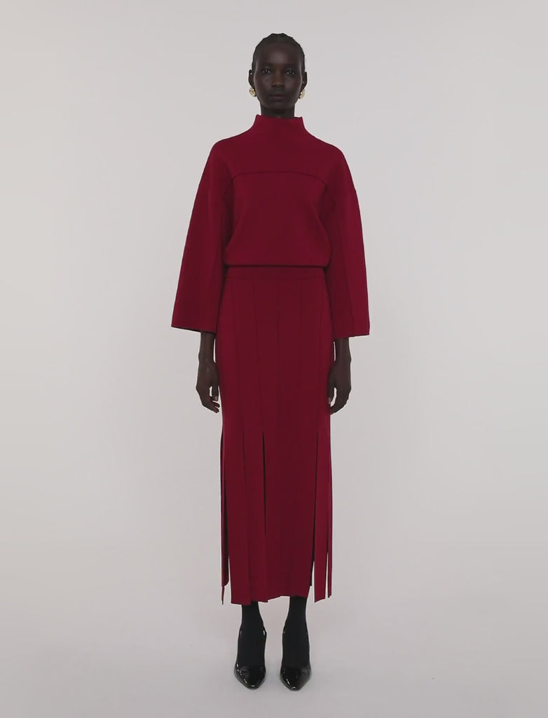 Le Jupe Lagny en jersey compact Milano est un modèle mi-long à panneaux, fabriqué à partir d'un mélange de viscose extensible qui s'adapte à la forme du corps. Une frange en ruban audacieuse accentue l'ourlet, apportant un sens de mouvement et de style à la silhouette.