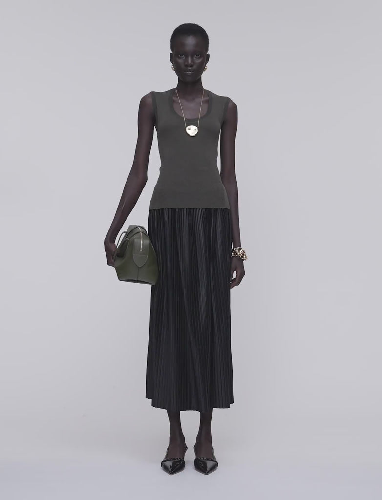 The Didi Light Nappa Leather Skirt is a striking mid-length style, crafted from ultra-lightweight nappa leather with a buttery-soft hand feel. Expertly constructed with plissé pleats, it offers luxurious texture and fluid movement. Designed for all-day comfort, the skirt is finished with a narrow waistband and a raw-cut hem for a modern edge.