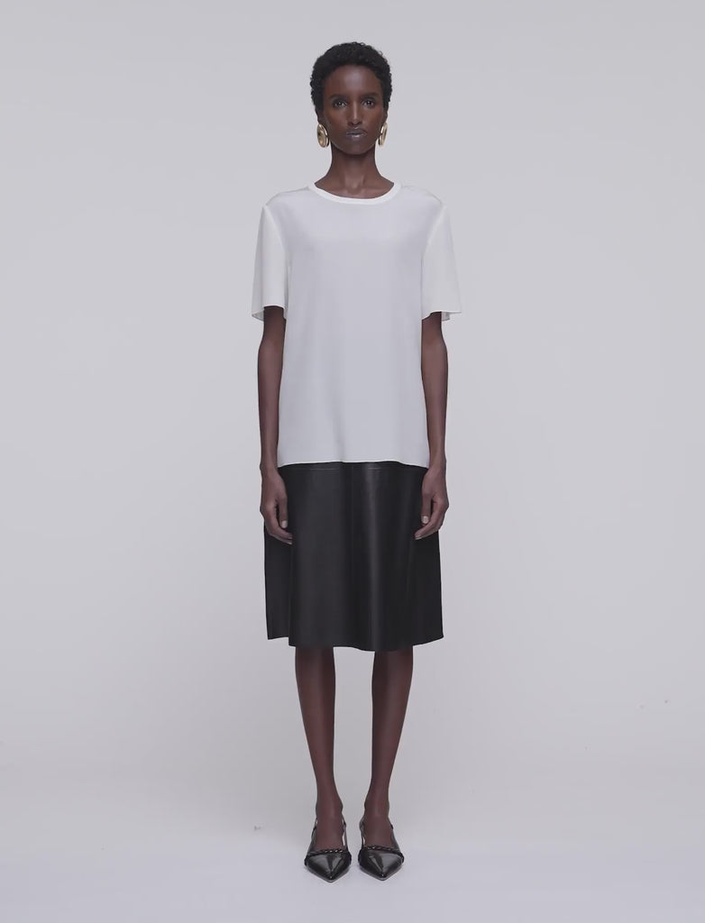 The Rubin Crepe de Soie Silk Blouse is a regular fit, straight cut top, crafted from a lightweight silk crepe. This essential style is an elevated take on the everyday t-shirt; minimal and crisp finished with a tonal ribbed neckline.