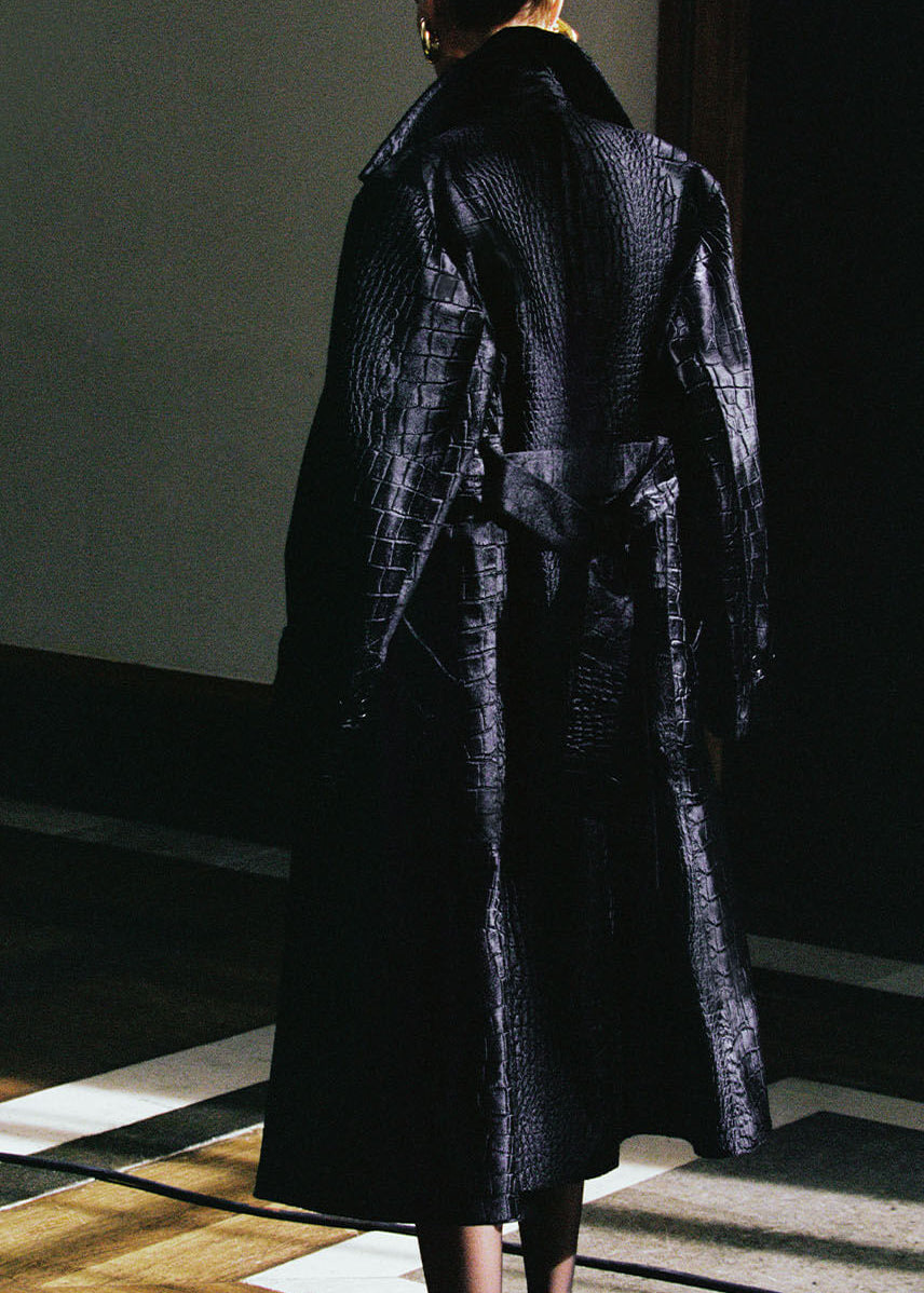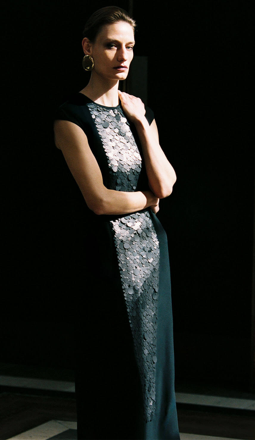 Intricate, artisanal detailing and surface texture stand out. From croc-embossed shearling to an innovative fluid double satin, sumptuous fabrics appeal to the senses with their heightened tactility. Multi-size, hand-sewn matte sequins add lustre and movement, whilst a gold lamé pleated skirt brings festive shimmer.